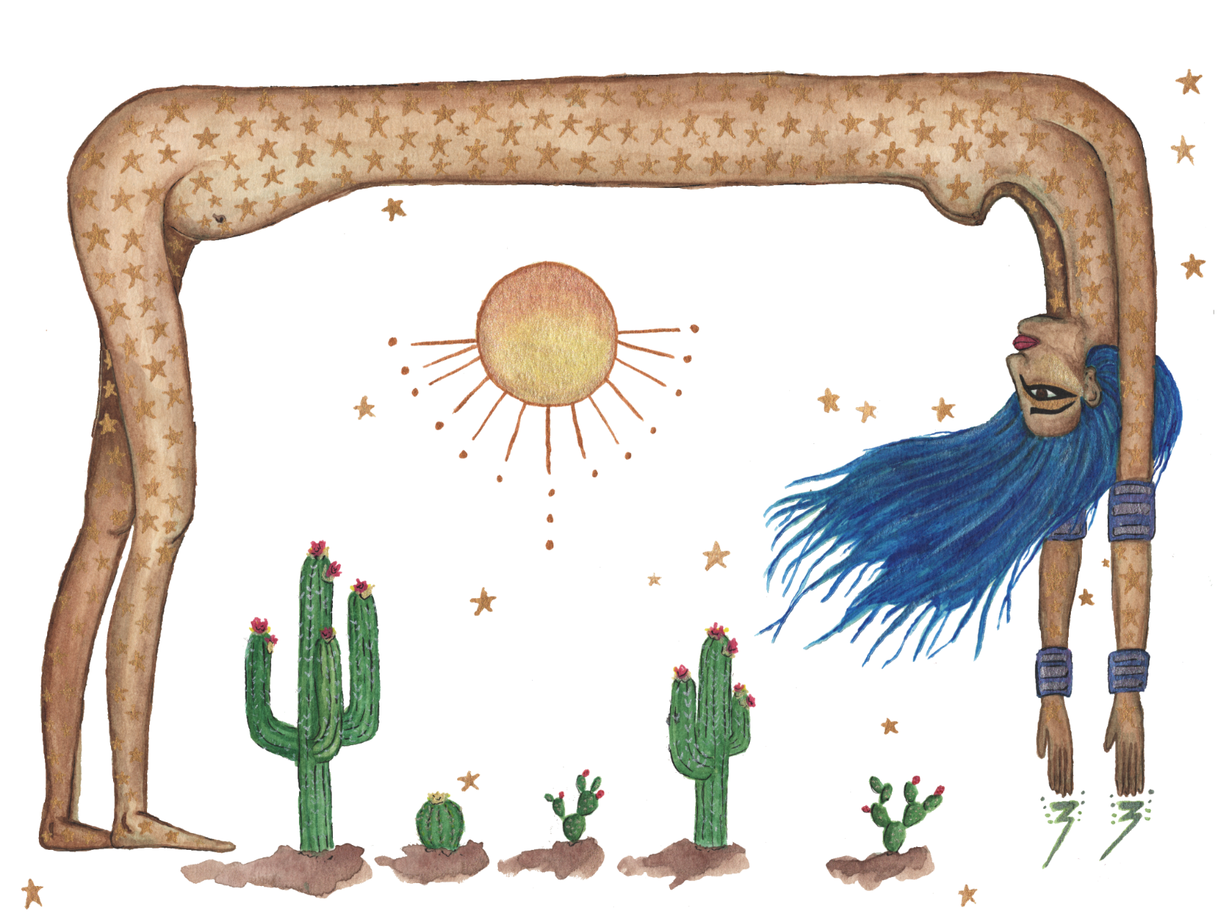 Nut, the Egyptian goddess of the sky and stars, was known for her nurturing and protective nature, much like that of a mother. Her arching over the earth creates a protective canopy, symbolizing her maternal instincts. In this watercolor painting, the idea of her safeguarding the Tucson Desert brings a sense of comfort and love.