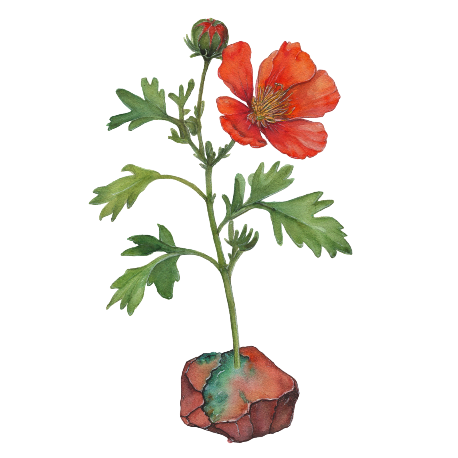 A delicate desert globemallow, a symbol of hope and resilience, bursts from the cracks of a weathered copper stone. The stone, representing strength and stability. Together, they speak of the beauty that can emerge from unexpected places and the unyielding spirit that thrives even in the toughest environments.